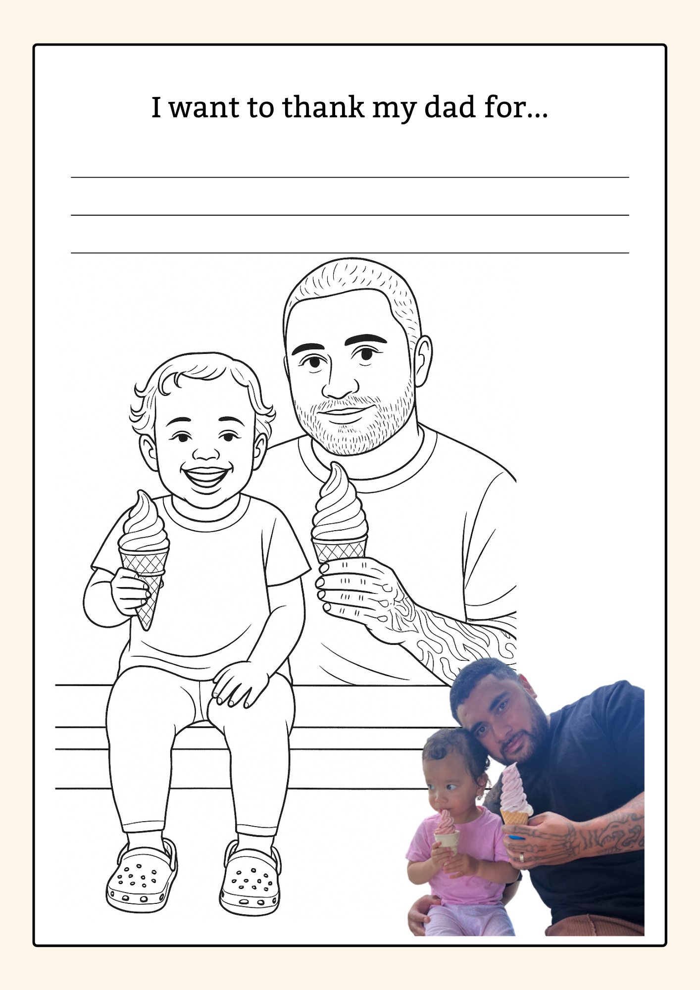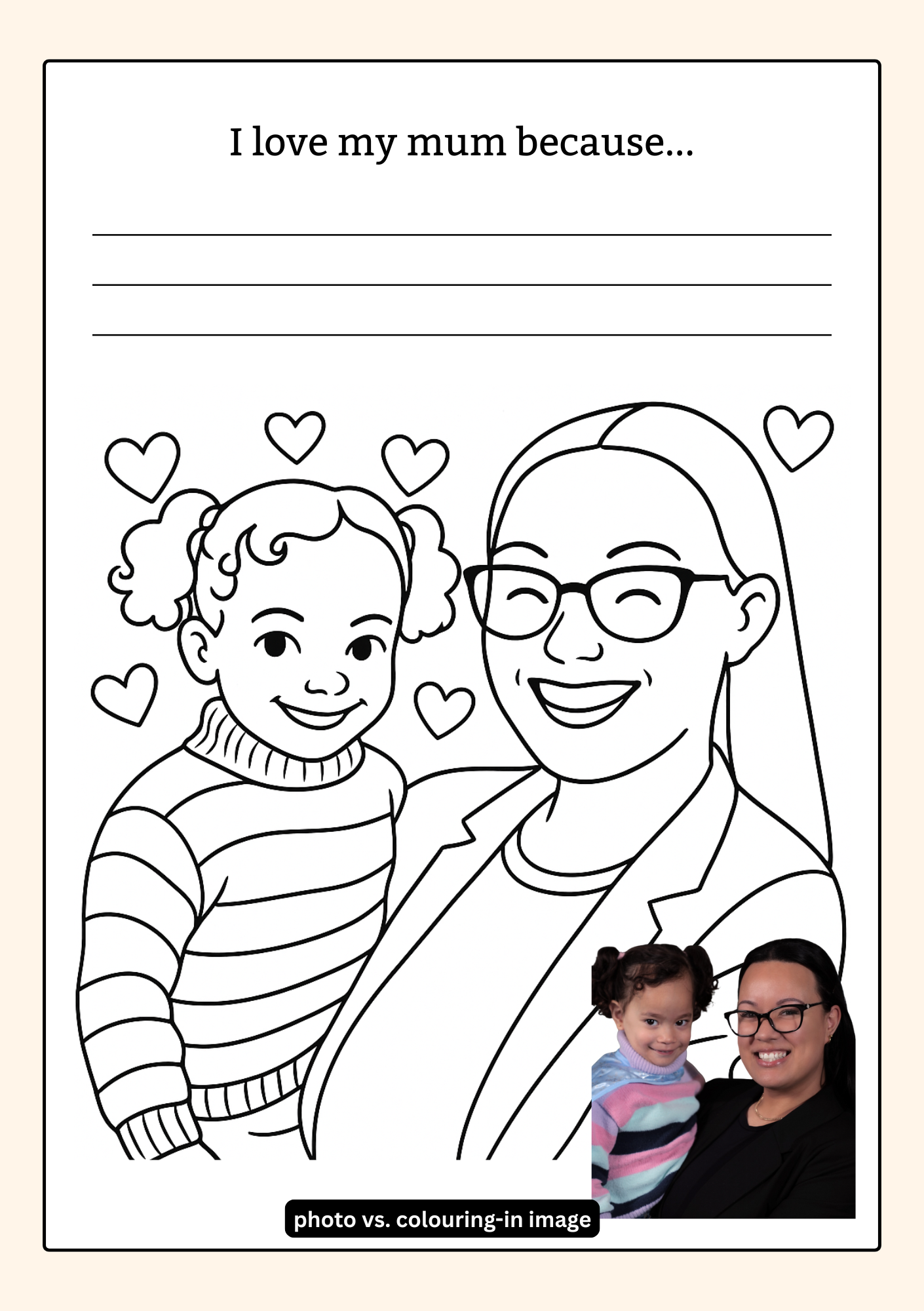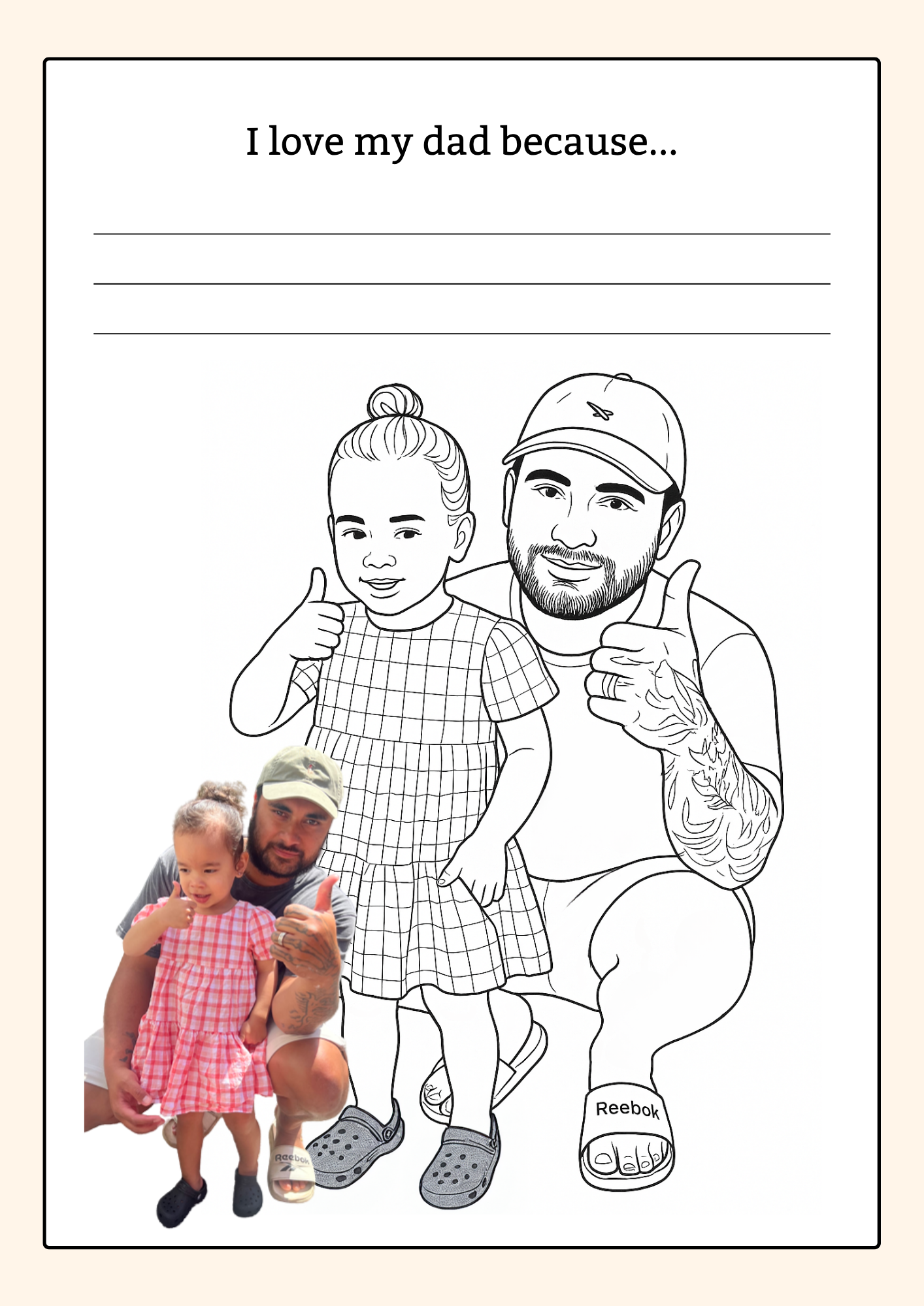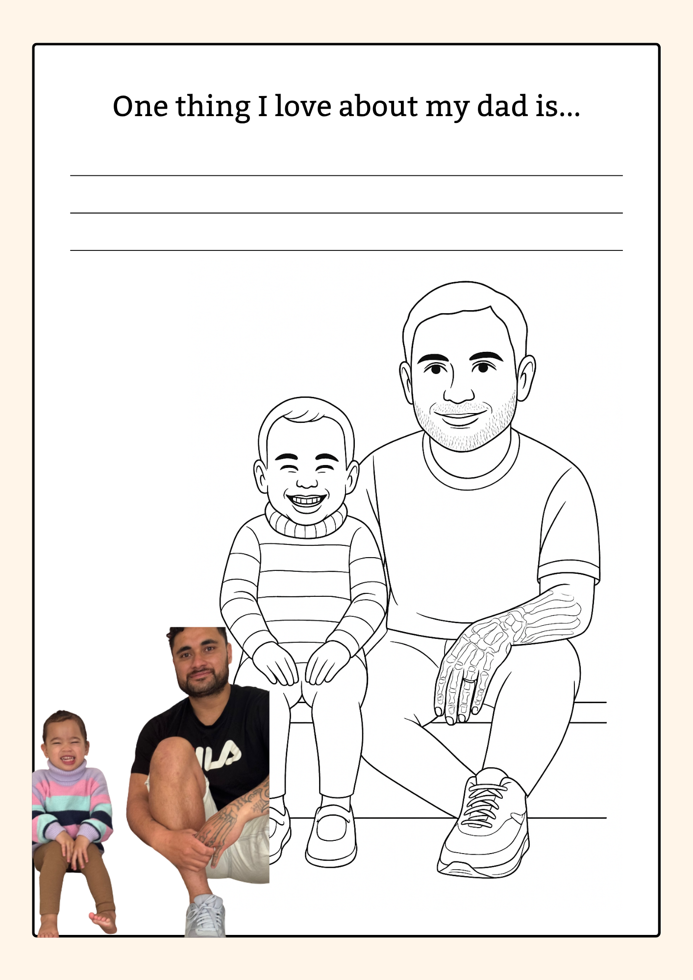 Each photo you provide is thoughtfully transformed into a cartoon-style colouring page, inspired by the original image. The illustrations aren’t exact replicas but are designed to capture the likeness and feel of your photos in a simple, child-friendly way.